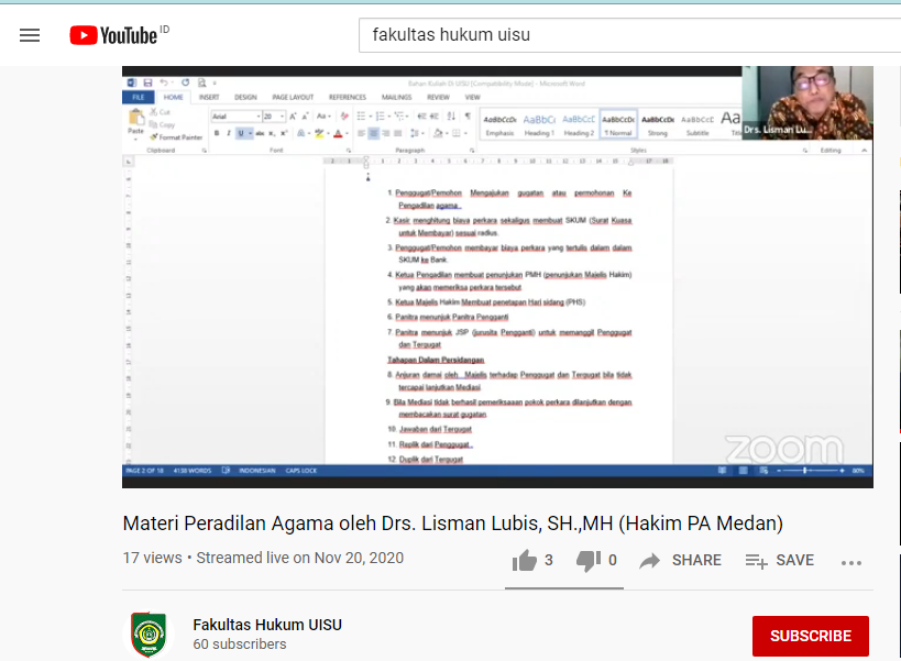 UISU, FH, Hakim Pengadilan Agama Medan Drs. Lisman Lubis,SH.,MH mengisi materi pada mata kuliah praktek hukum acara peradilan agama pada Fakultas Hukum Universitas Islam Sumatera Utara secara daring melalui aplikasi zoom cloud meeting, Sabtu (21/11).